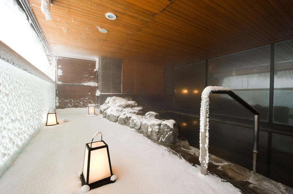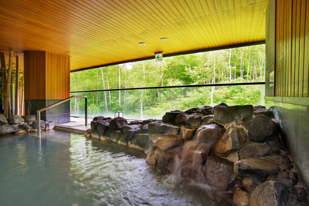 酒店的溫泉泉水來自二世古藻岩山,屬碳酸氫鈉泉,住客可以在室內溫泉大浴場或露天風呂(開放時間:12:00~翌日10:00)享受泡溫泉的樂趣,放鬆身心。溫泉的更衣室也是由隈研吾大師設計,非常有特色。