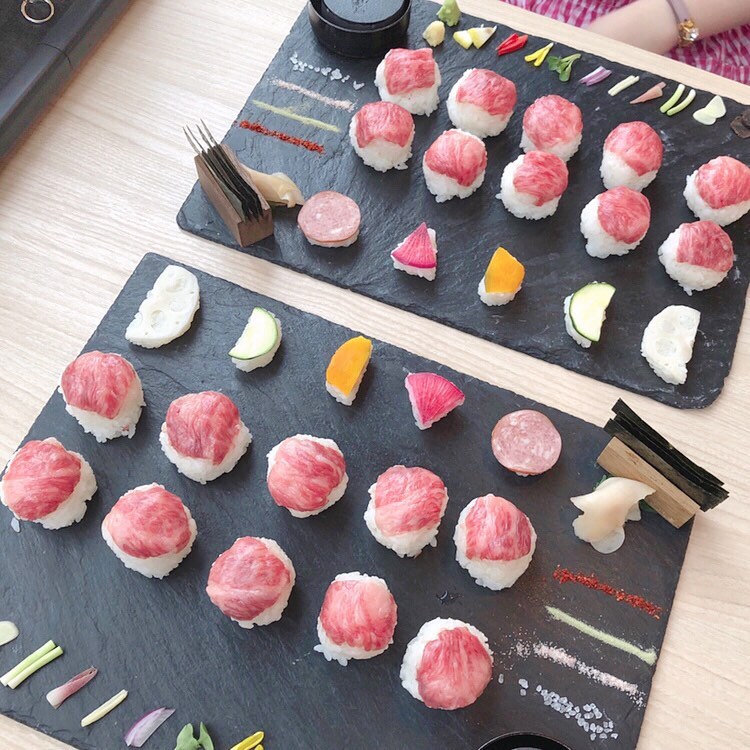 而另一個非常受歡迎的品項則是「霜降黑毛和牛手毬壽司」,黑色鐵板上放著10顆生霜降黑毛和牛的手毬壽司,食客可透過旁邊的加熱石,將牛肉烤成自己喜歡的熟度!