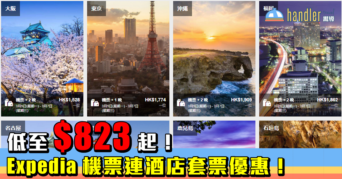 廉航 HK Express 推出只限 8 日的 Mega Sale,Expedia 同步開賣各航點的平價套票,機票連兩晚酒店連稅低至 HK$823起,十分划算!出發日期至10月27日,想去日本的朋友留意啦!