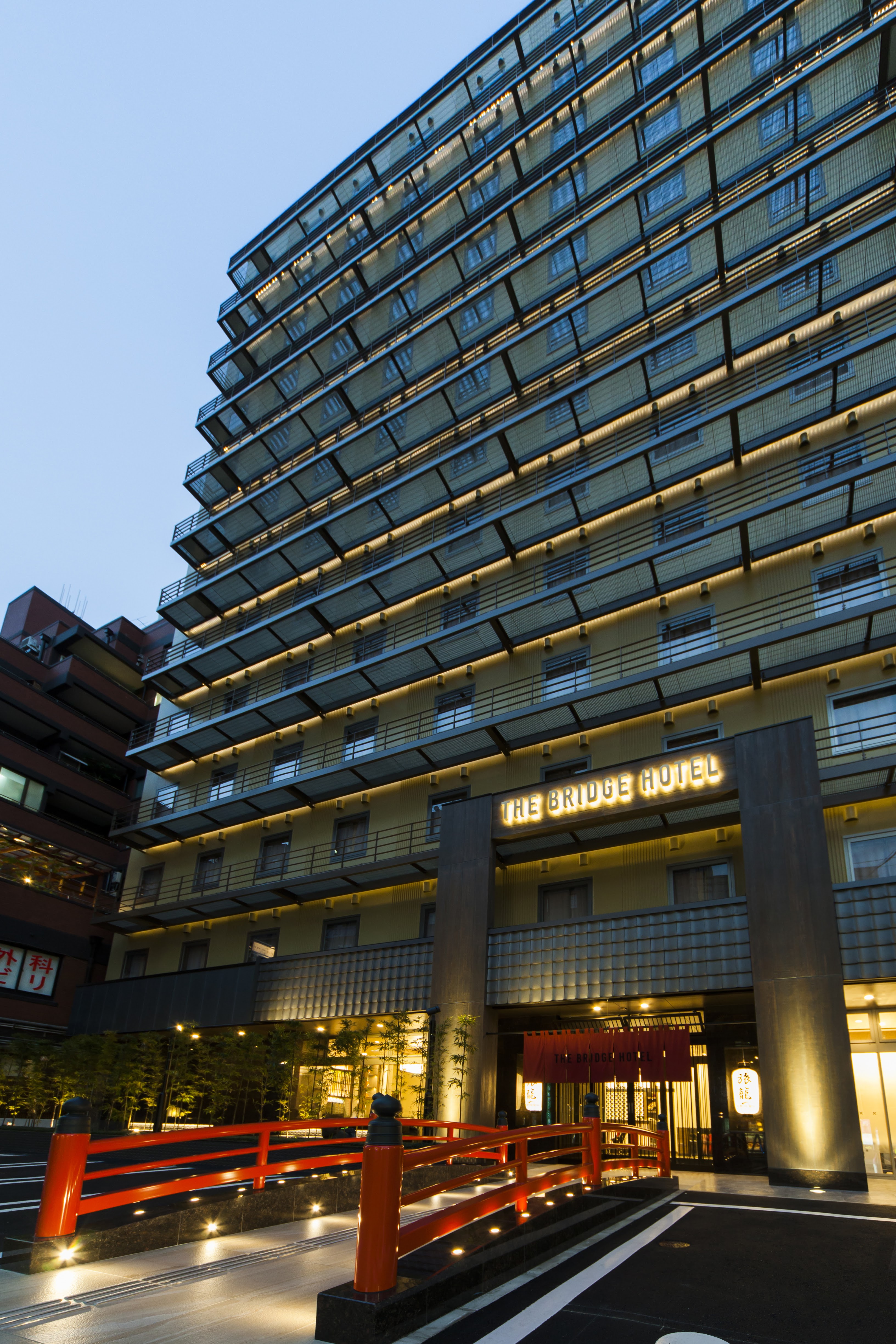 The Bridge酒店心齋橋 在酒店的外觀設計上加入了不少日式元素:正門的朱紅色拱橋、天台模仿
