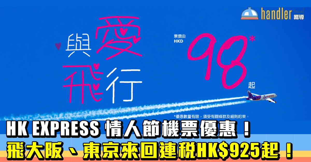 HK EXPRESS 推出情人節機票優惠「與愛飛行」,單程票價由 HK$98 起。預訂日期由 2 月 12 日~ 18 日,出發日期由 2 月 19 日~ 4 月 13 日,飛大阪單程HK$239起(來回連稅HK$961起)、東京單程HK$239起(來回連稅HK$925起)。
