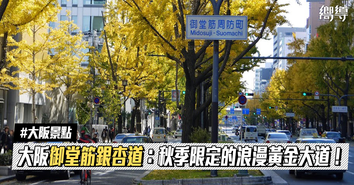 大阪御堂筋通由南至北貫通大阪市中心,近千棵銀杏樹由梅田斷斷續續伸延至難波長約4.2公里,每年11月下旬至12月上旬就會變成金黃色,形成一條秋季限定嘅浪漫黃金大道(御堂筋通りのイチョウ並木)!