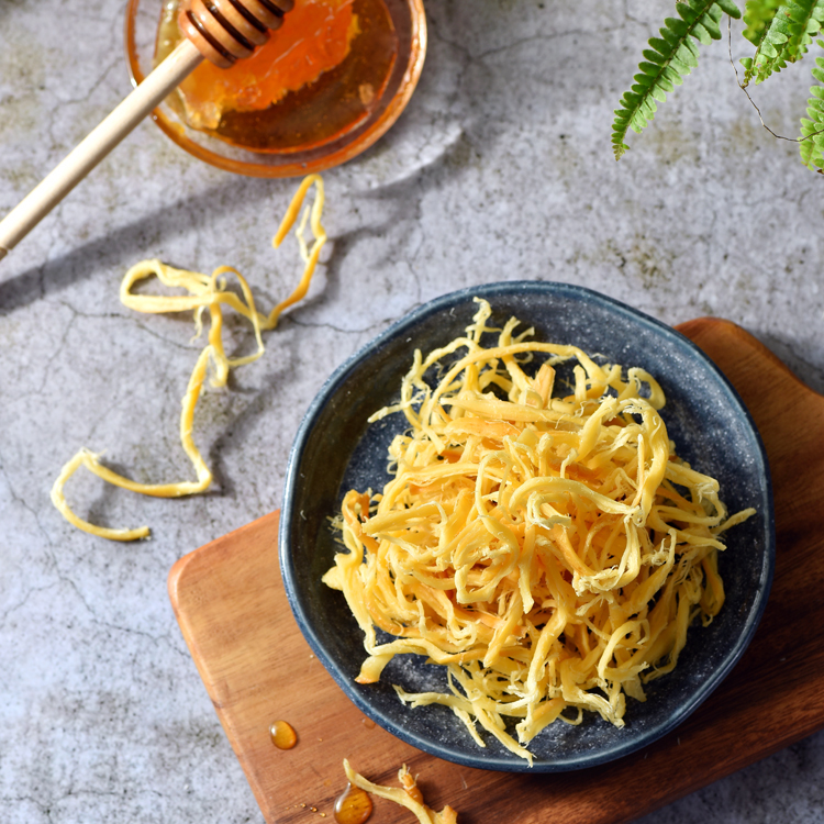 這一條條看似是魷魚絲的東西,其實是由牛奶製成的乳酪絲!選用巴西進口頂級原條乳酪,以人手剝成一絲絲後,再用傳統碳火烘烤而成,每一公斤的乳酪絲都用了足足16公升牛奶才能做出來,入口奶味濃郁,外層口感酥脆,內裡則濕潤有嚼勁,除了原味之外,加了蜂蜜的乳酪絲也同樣受歡迎,更獲頒發世界品質評鑑大賞銀質獎!