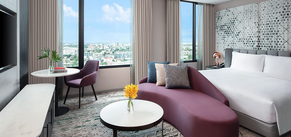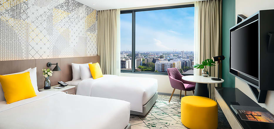 酒店共有4種不同的客房,房間寬敞帶點工業風,朝氣時尚,所有客房更享有天際線景觀,可以在房間內將曼谷美景盡收眼底。